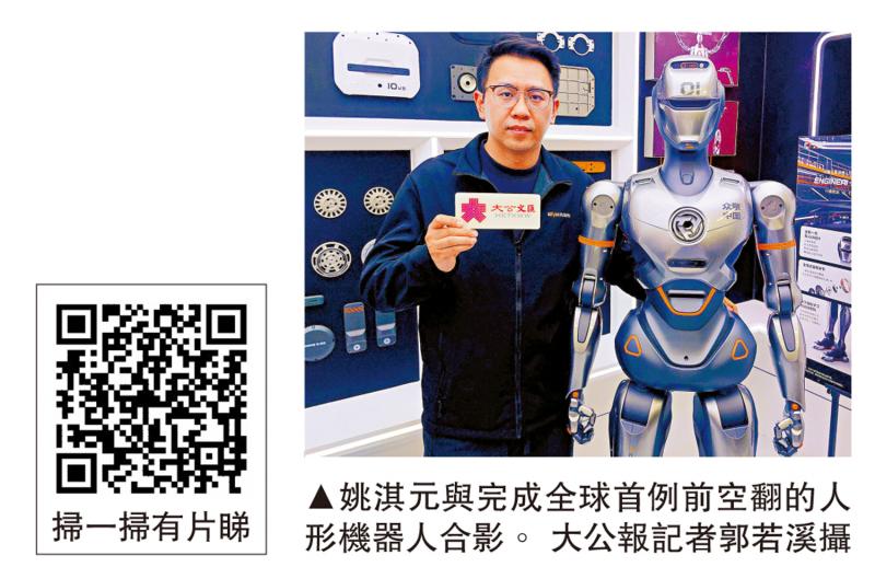 图:姚淇元与完成全球首例前空翻的人形机器人合影。\大公报记者郭若溪摄
