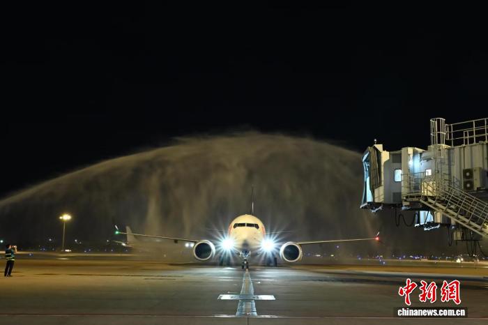 1月1日晚,青岛机场联合山东航空开通了直飞越南胡志明市的往返航线。该航线首班飞机通过“水门礼”迎接旅客。(山东航空供图)