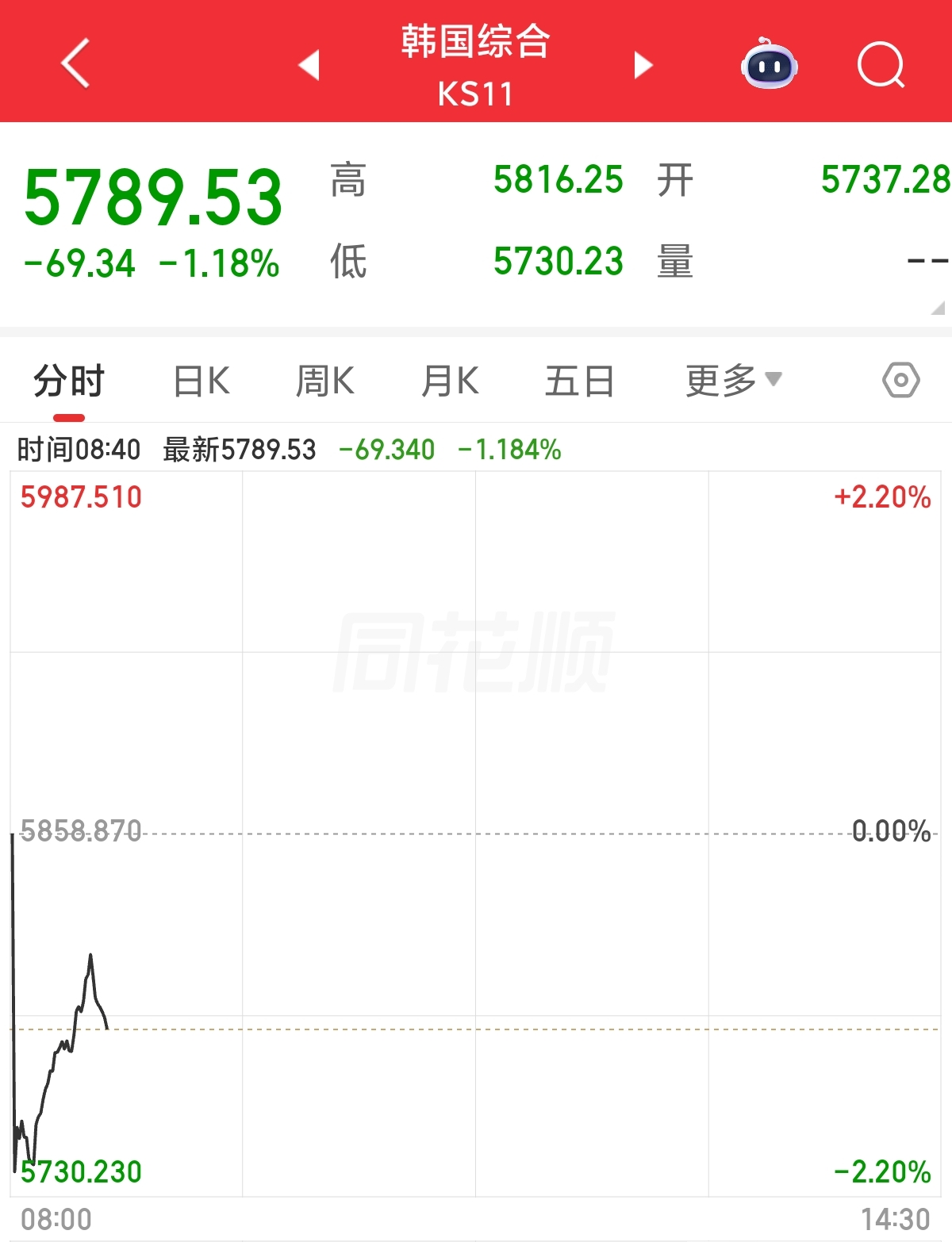 韩国*方面,韩国综合指数盘中跌幅超2%,最终报收5789.53点,跌幅1.18%。