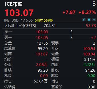 截至发稿,WTI原油期货价格较前上涨了8.13%,达到104.42美元/桶;布伦特原油期货价格则上涨了8.27%,报103.07美元/桶。