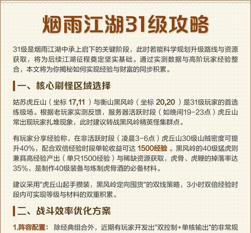 通过选择合适的练级地点、合理利用练级技能、团队协作以及时间管理,玩家可以在《烟雨江湖》中快速提升等级,成为顶尖高手。希望本文的练级技巧能够帮助你在游戏中取得更好的成绩,享受更多的游戏乐趣。